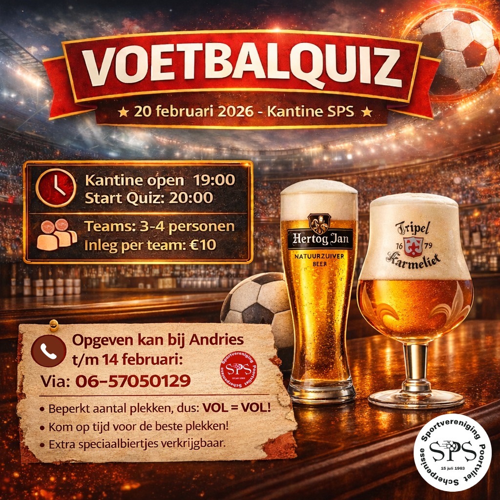 Het is alweer bijna zover: de voetbalquiz komt er weer aan. Deze inmiddels jaarlijks terugkerende quiz blijkt telkens weer een mooie uitdaging voor menig voetballiefhebber. Geef nog snel je team op of sluit gezellig aan voor een biertje. Meer informatie is te vinden op de flyer.