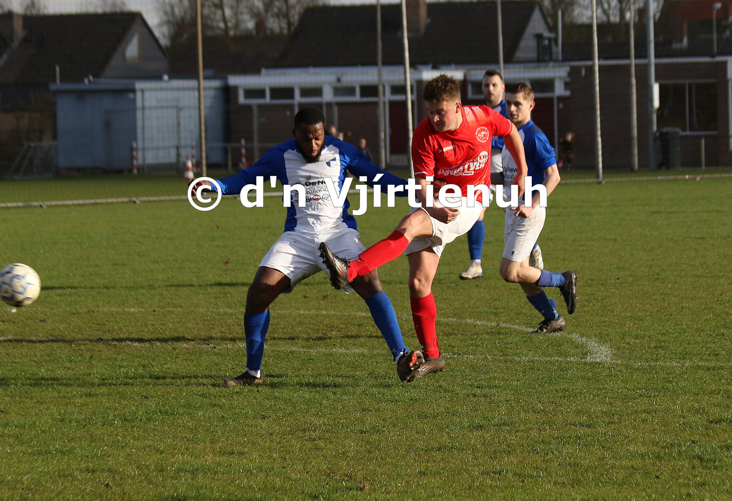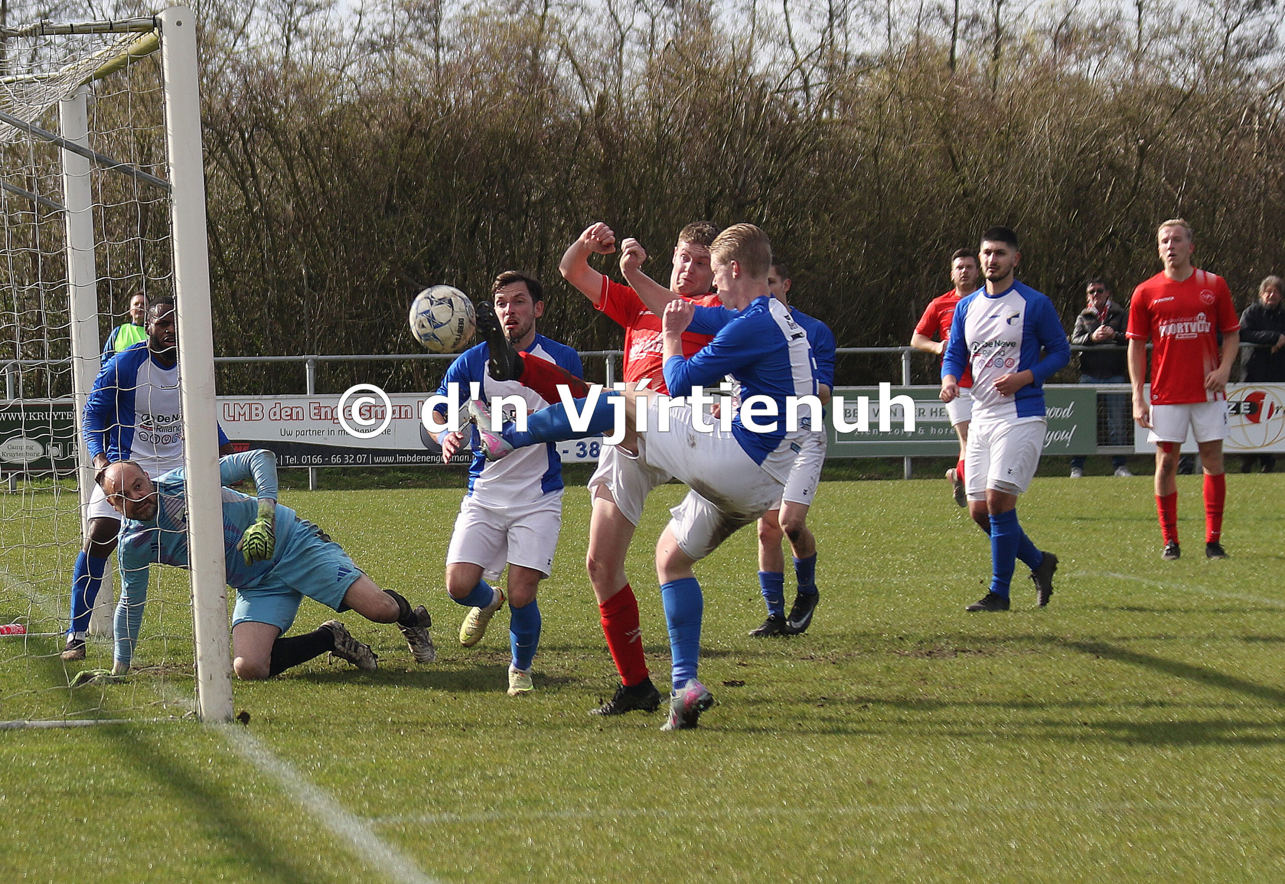 Foto 2: Scrimmage voor het doel, waarbij Martijn van Haaften net te laat komt