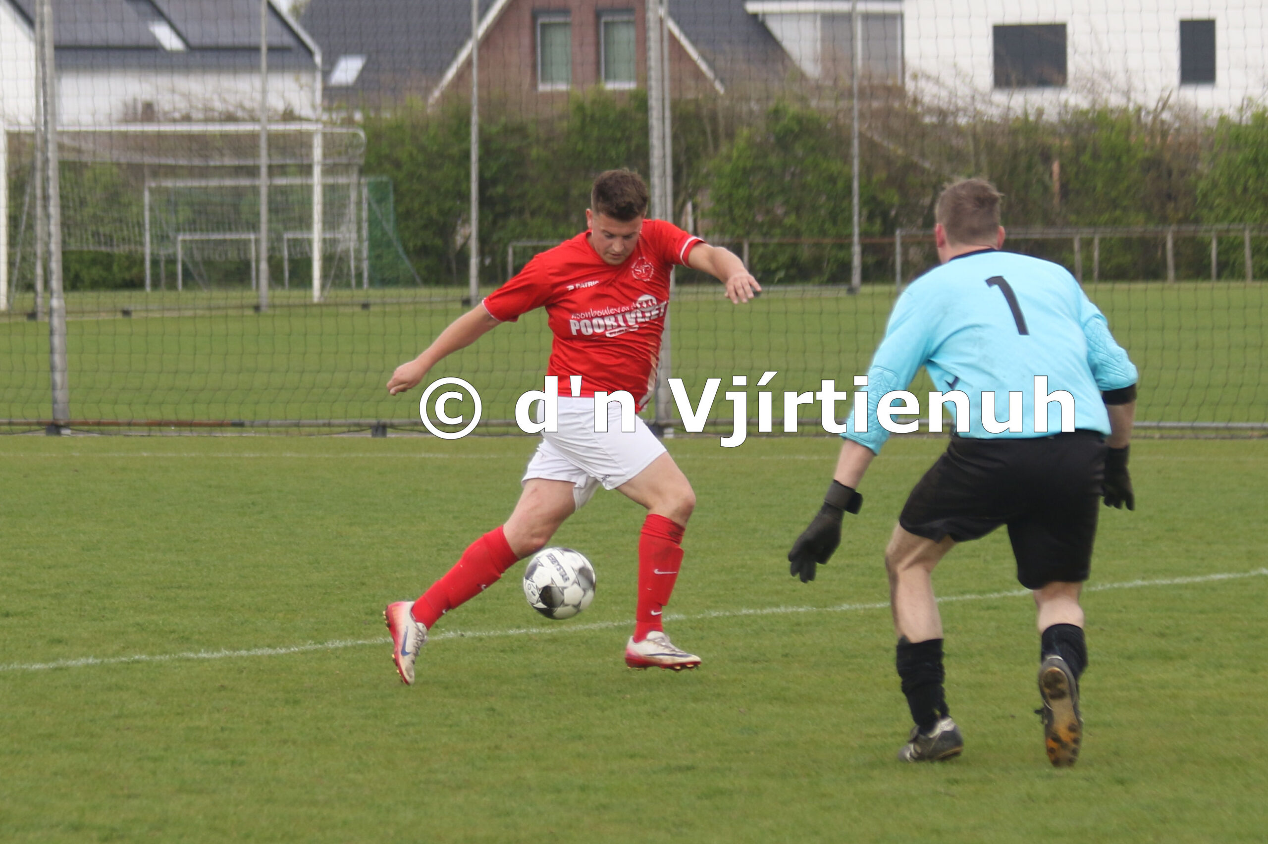 Tot aan de 2-0 viel het allemaal nog redelijk mee, daarna werd het dus slordig. Al na 8 minuten viel de 1-0, toen een doorgekopte bal van Andries de Jong op waarde werd geschat door broer en jubilaris Wilmer, die de 1-0 binnentikte. De 2-0 in de 20e minuut was een fraai staaltje onzelfzuchtigheid van verdediger Artjan Feijtel, die alleen voor de keeper de bal keurig opzij legde voor de meegelopen Justin van der Slikke. Die kon de bal zo binnenlopen.