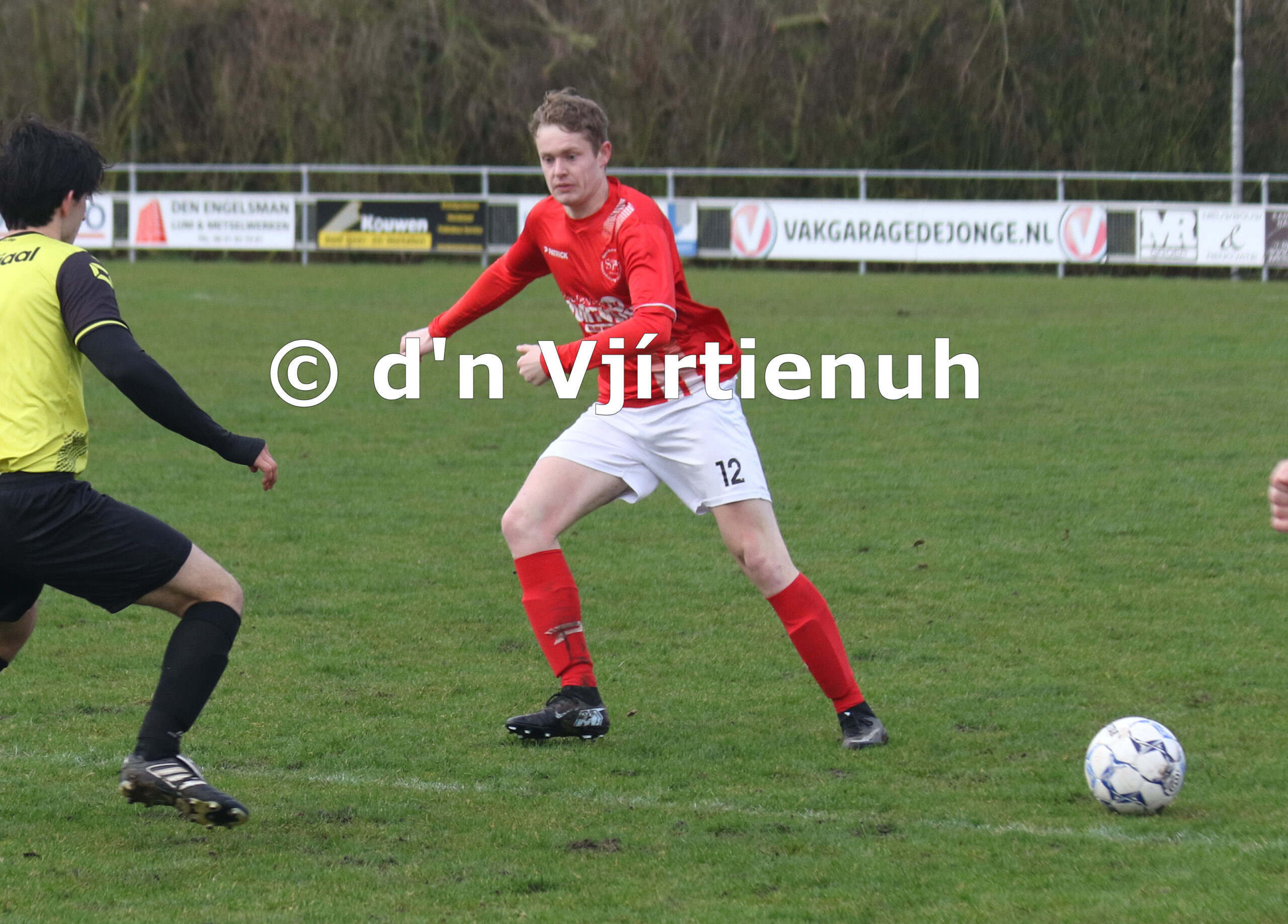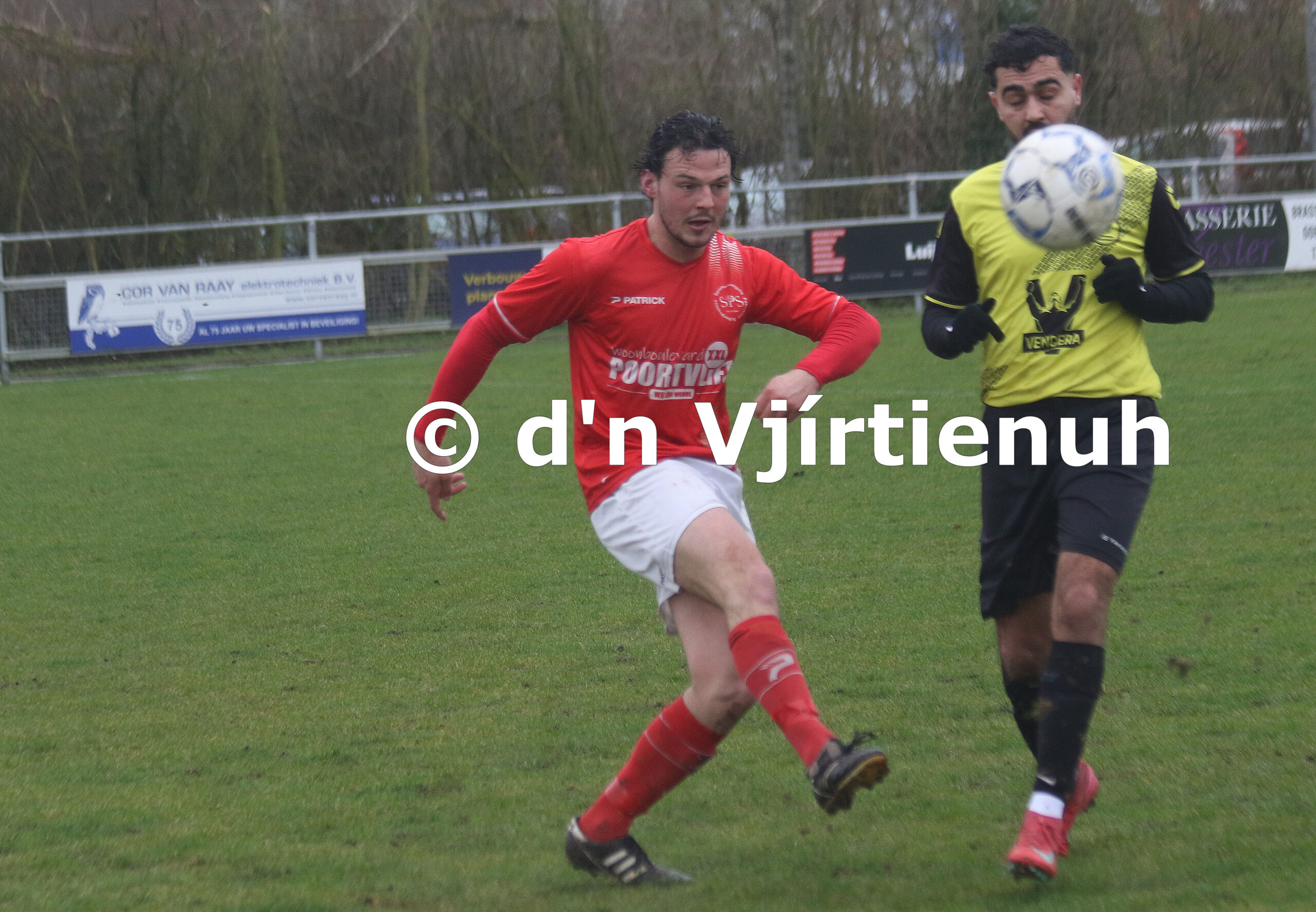 De eerste helft begon zoals alle wedstrijden na de winterstop (nog steeds de erfenis van het trainingskamp?). SPS zette druk en liet de tegenstander niet tot rust komen. Met enkele afstandsschoten werd de doelman van de bezoekers getest, of er werd naast of overgeschoten. Justin van der Slikke, René de Groen en Andries de Jong probeerden het, maar wisten de sleutel tot het doel (nog) niet te vinden. Tot de 32e minuut, toen wederom een snelle aanval terechtkwam bij laatstgenoemde Andries, die van buiten het 16-metergebied naar binnen dribbelde en met een venijnig schot de 1-0 op het scorebord wist te zetten.